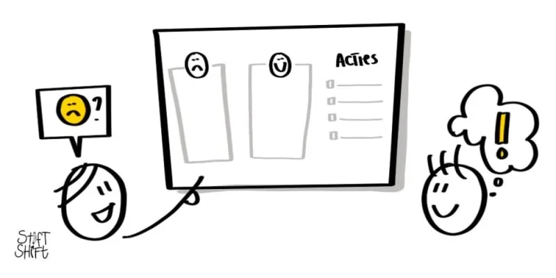 Oefen dan vooraf een paar simpele tekeningen/iconen die ‘terugblik’, ‘vieren’ en ‘toekomst’ voor jou uitbeelden. Als je dat een paar keer oefent, dan kun je die vaak ter plekke heel makkelijk al tekenen.